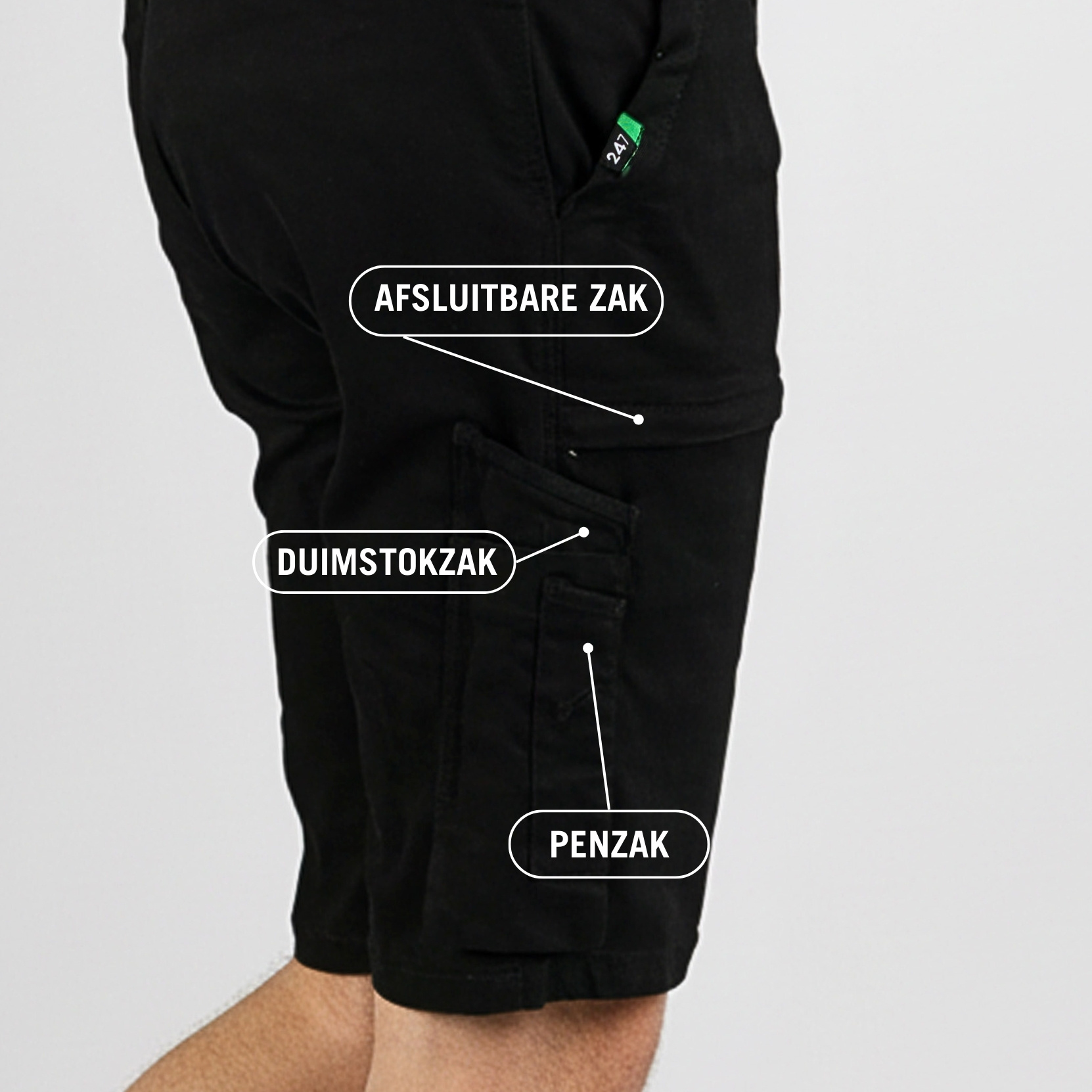 - Functionaliteit: Afsluitbare zak, Duimstokzak, Inpandige zak, Penzak, Steekzak, Zijzak